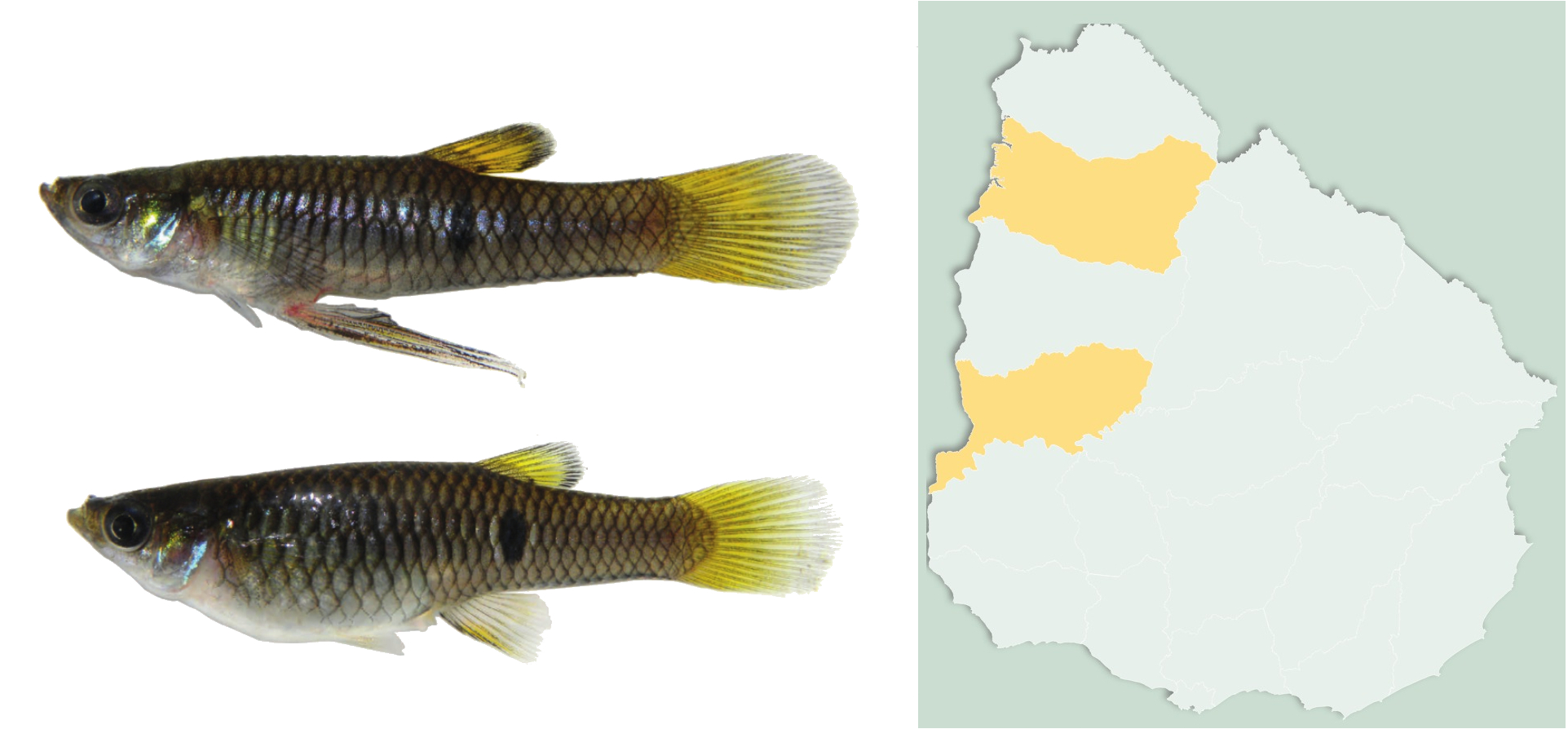 Macho (arriba) y hembra (abajo) de _Phalloceros mimbi_. Foto: Wilson Serra et al. 2025