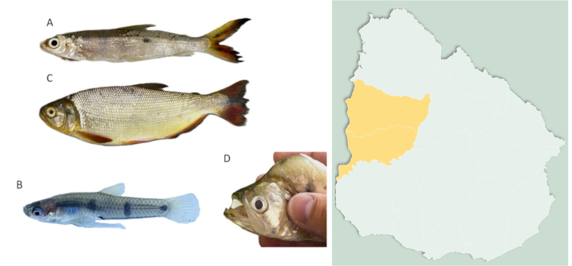 A) _Hemiodus orthonops_ B) _Cnesterodon raddai_ C) _Brycon hilarii_ D) _Cynopotamus kincaidi_. Tomado de Iván González et al. 2025