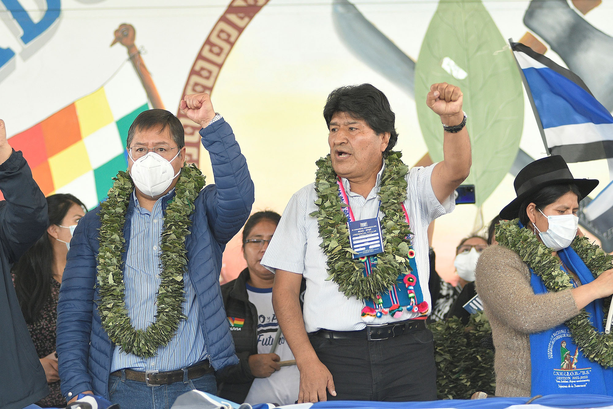 Luis Arce y Evo Morales, durante el inicio del Congreso Orgánico del Movimiento Al Socialismo (MAS), el 4 de agosto, en la comunidad de Lauca Ñ , Bolivia.