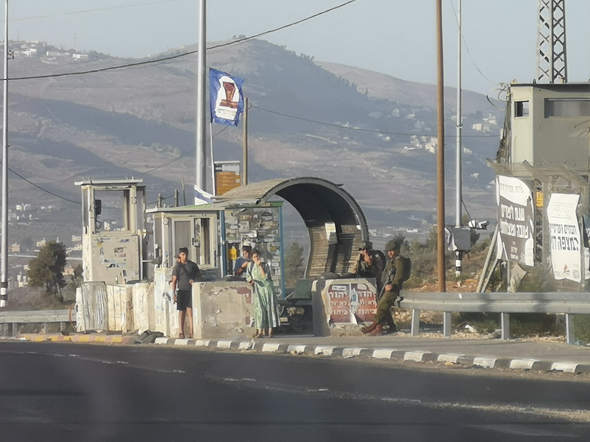 Colonos y soldados en una parada de ómnibus a la salida del pueblo de Bares, entre los asentamientos de Ari'el y Barkan.