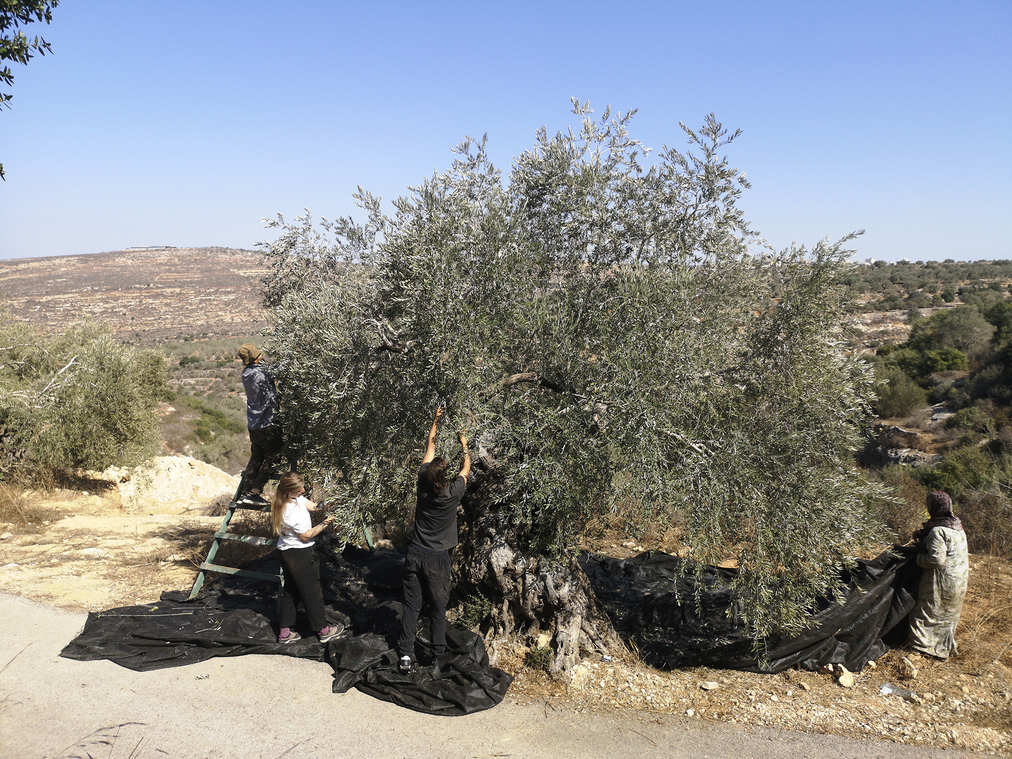 Rajab (i), cocinero de golosinas de profesión, recolectando olivos en los campos de su familia, junto a dos voluntarios internacionales y su madre (d). De fondo se ve uno de los asentamientos del "dedo de Ariel".