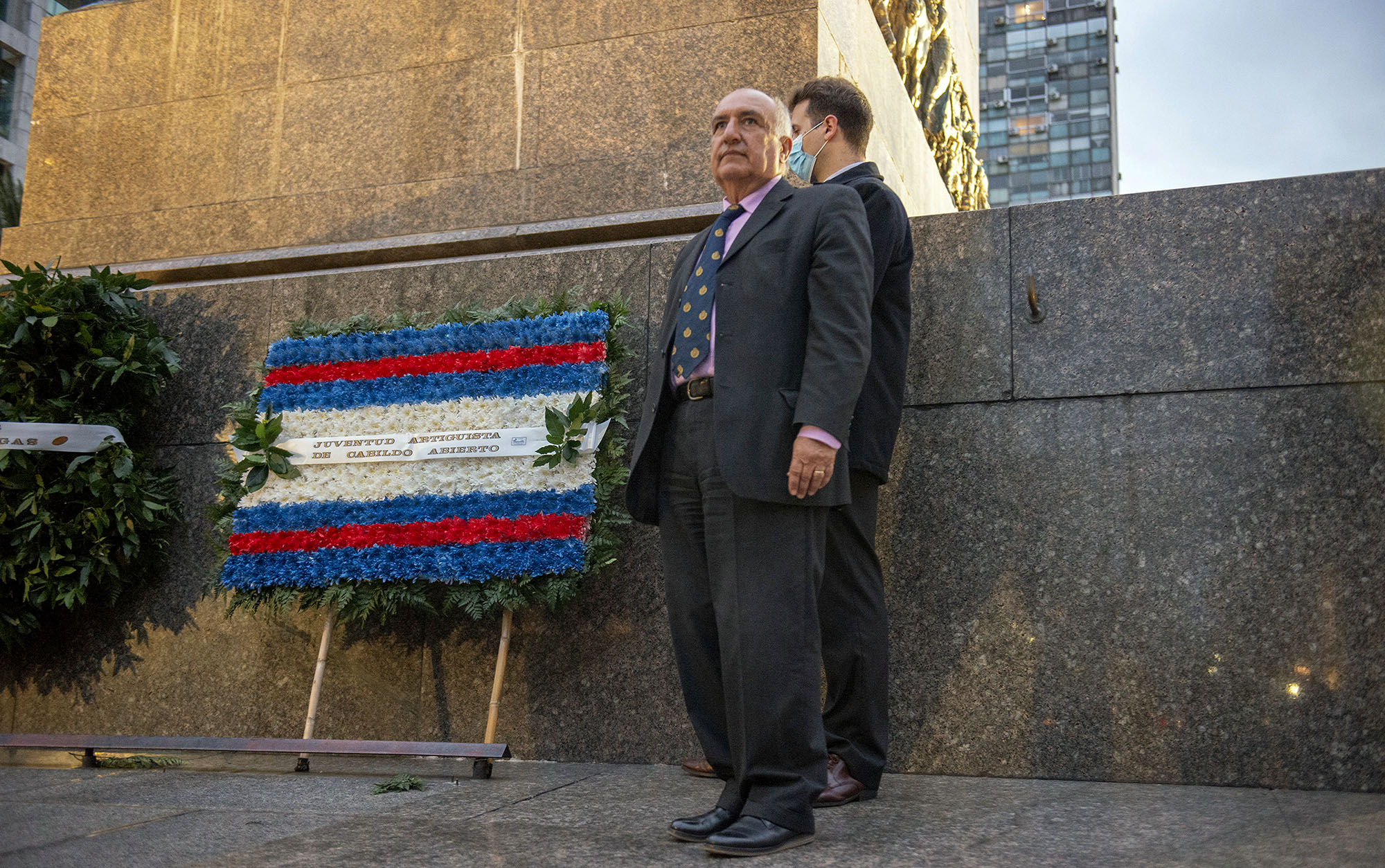 Guillermo Domenech durante la colocación de una ofrenda floral a José Artigas por parte de la Juventud de Cabildo Abiero, este jueves, en la plaza Independencia.