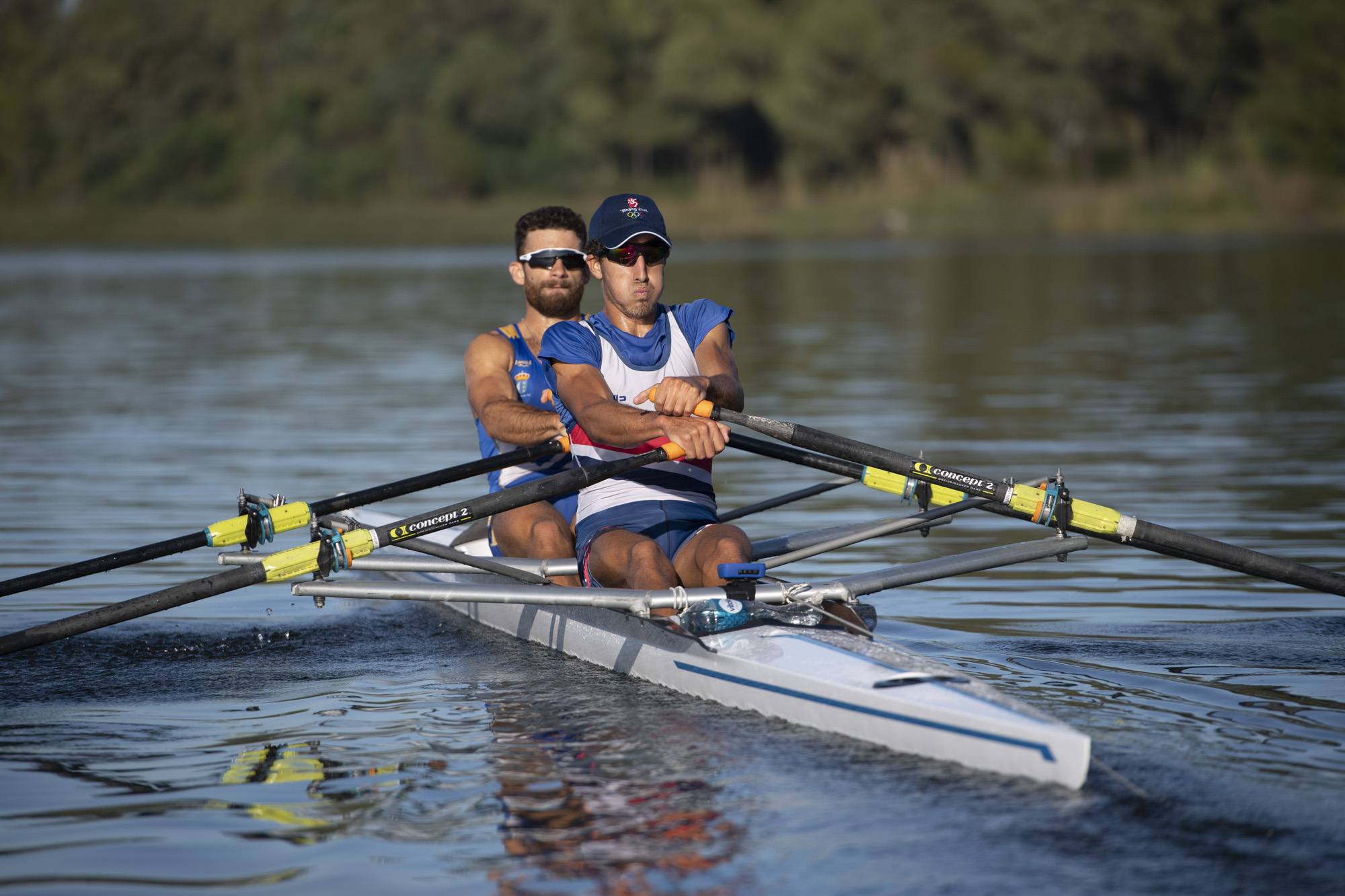 Felipe Klüver y Bruno Cetraro, durante un entrenamiemto de la selección pre olímpica de de remo, en el Lago Calcagno. (archivo, marzo de 2020)