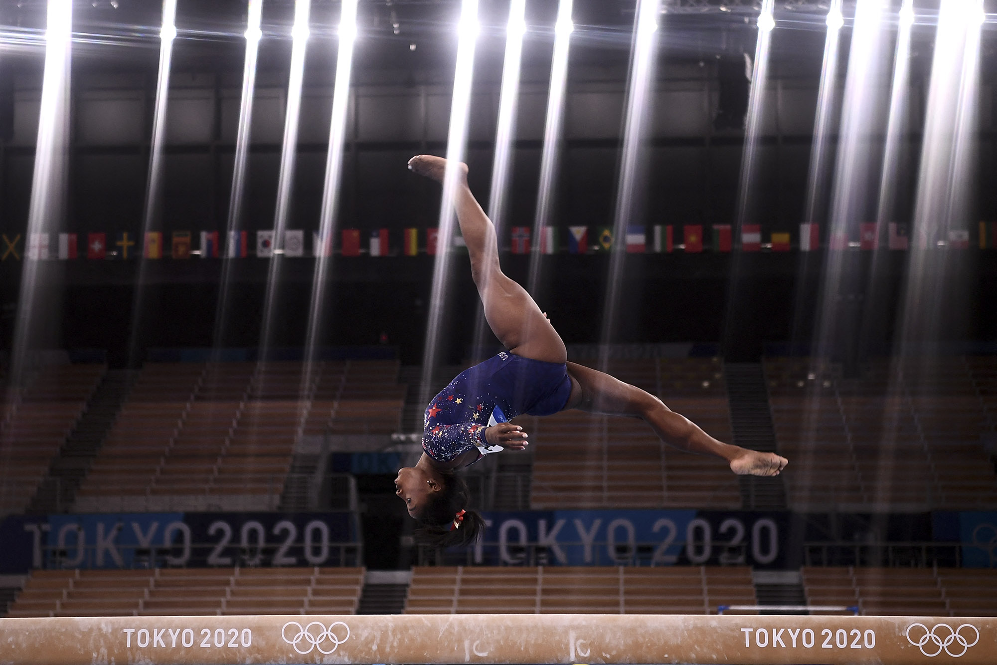 La gimnasta estadounidense, Simone Biles, en la barra de equilibrio, en el Centro de Gimnasia Ariake en Tokio.