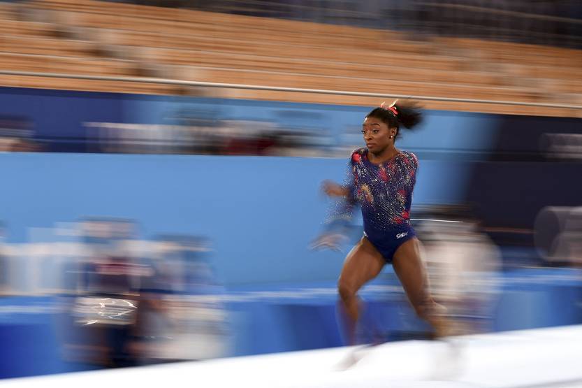 Simone Biles, durante la competencia de salto en gimnasia artística, en el Centro de Gimnasia Ariake, el 25 de julio, en Tokio 2020.
