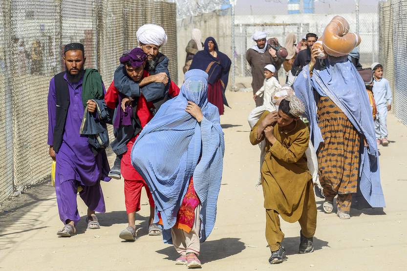 Familias afganas llegan a Pakistán a través del paso fronterizo en Chaman, el 24 de agosto de 2021, tras la victoria militar del movimiento Taliban en Afganistán por los talibanes.