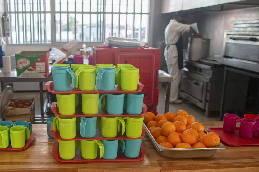 Trabajadores de cocina en la Escuela 319, en Montevideo. (archivo, junio de 2021)
