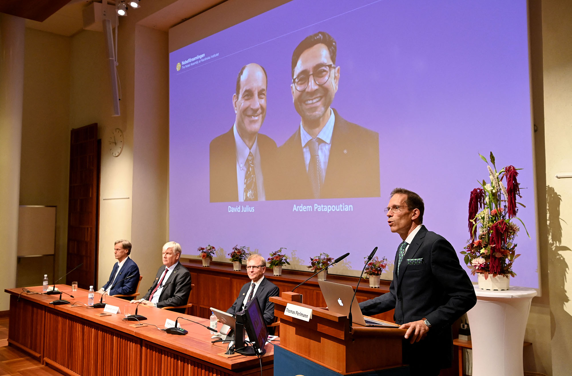 Thomas Perlmann (D), Secretario del Comité Nobel, durante la conferencia de prensa donde anuncia el Premio Nobel de Fisiología o Medicina 2021 para David Julius (I) y Ardem Patapoutianes, en el Instituto Karolinska de Estocolmo, el 4 de octubre, Suecia. Foto: Jonathan Nackstrand, AFP
