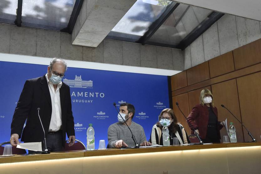 Gustavo Olmos, Daniel Caggiani, Ana Olivera y Cristina Lustemberg, el 8 de octubre, durante la conferencia de prensa por la presentación de un recurso ante el Poder Ejecutivo, en el anexo del Palacio Legislativo, en Montevideo.