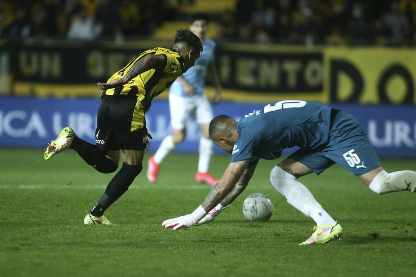 Facundo Torres, de Peñarol y Gastón Guruceaga, arquero de Montevideo City Torque, en la jugada del primer gol de Peñarol.