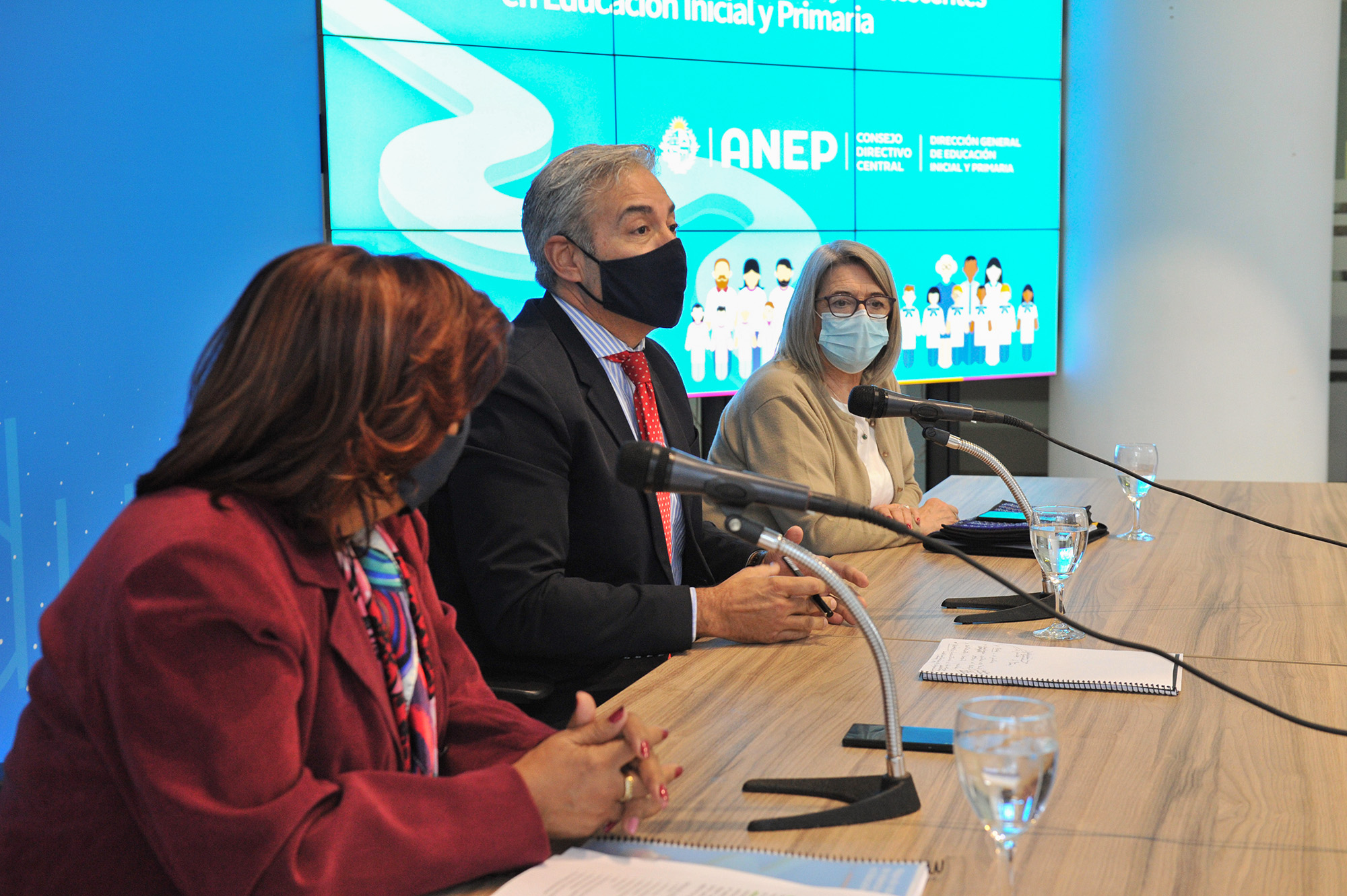 Graciela Fabeyro, Robert Silva y Gloria Canclini, durante la presentación del mapa de ruta para abordar situaciones de violencia en el ámbito escolar, el 20 de octubre, en la sede de la ANEP.