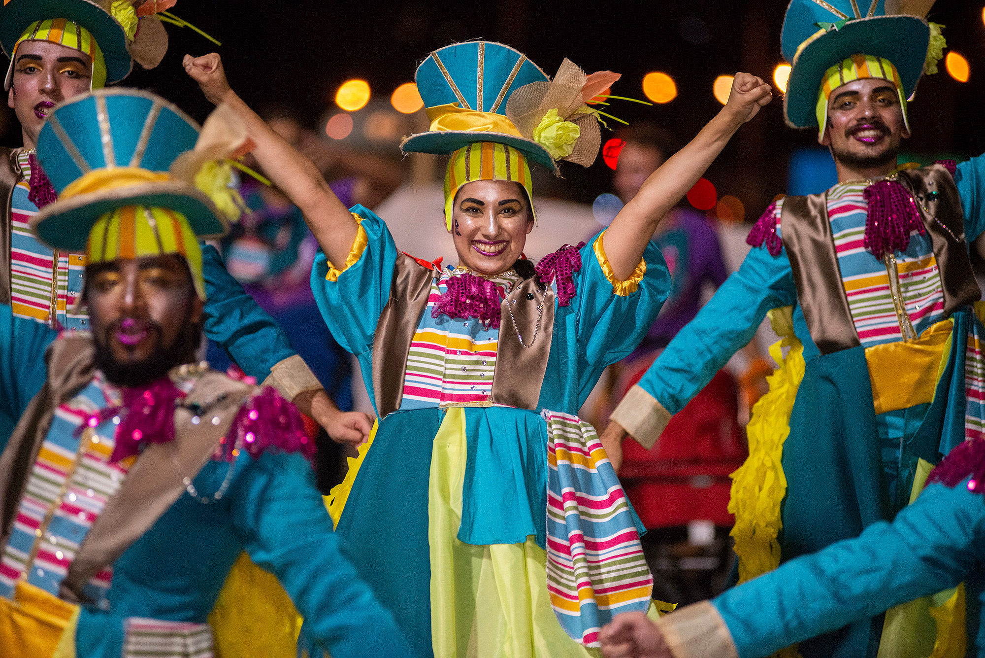 Parodistas Aristophanes, durante el Desfile Inaugural del Carnaval 2022, el 20 de enero, en las canteras del Parque Rodó.