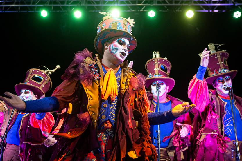 Murga La Cayetana, durante el Desfile Inaugural del Carnaval 2022, el 20 de enero, en las canteras del Parque Rodó.