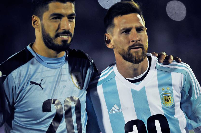 Luis Suárez y Lionel Messi, previo al partido Uruguay y Argentina por las Clasificatorias para el mundial Rusia 2018, en el estadio Centenario (archivo, agosto de 2017).