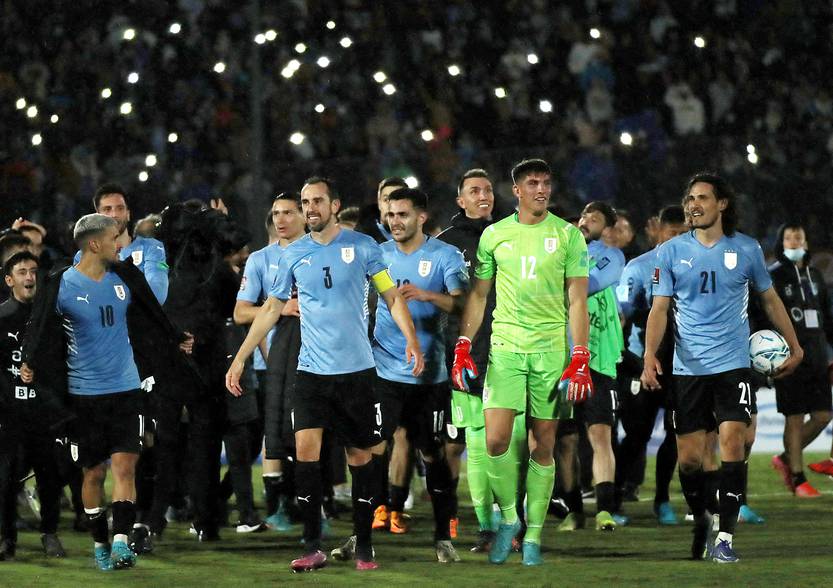 Jugadores de Uruguay festejan tras ganar el partido contra Perú, en el Estadio Centenario.