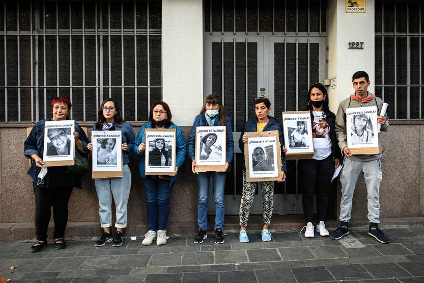 Familiares junto a integrantes de la organización ¿Dónde están nuestras gurisas?, en la puerta de la Fiscalía de Delitos Sexuales, Violencia Doméstica y Violencia basada en Género, Montevideo (01.04.2022).