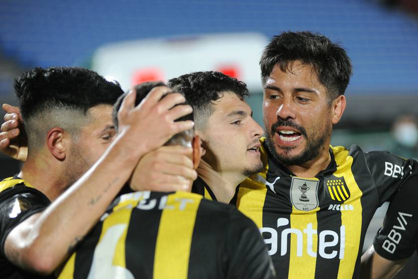 Los jugadores de Peñarol festejan el gol de Agustín Álvarez Martínez, ante Torque , el sábado 23 de abril en el estadio Centenario.
