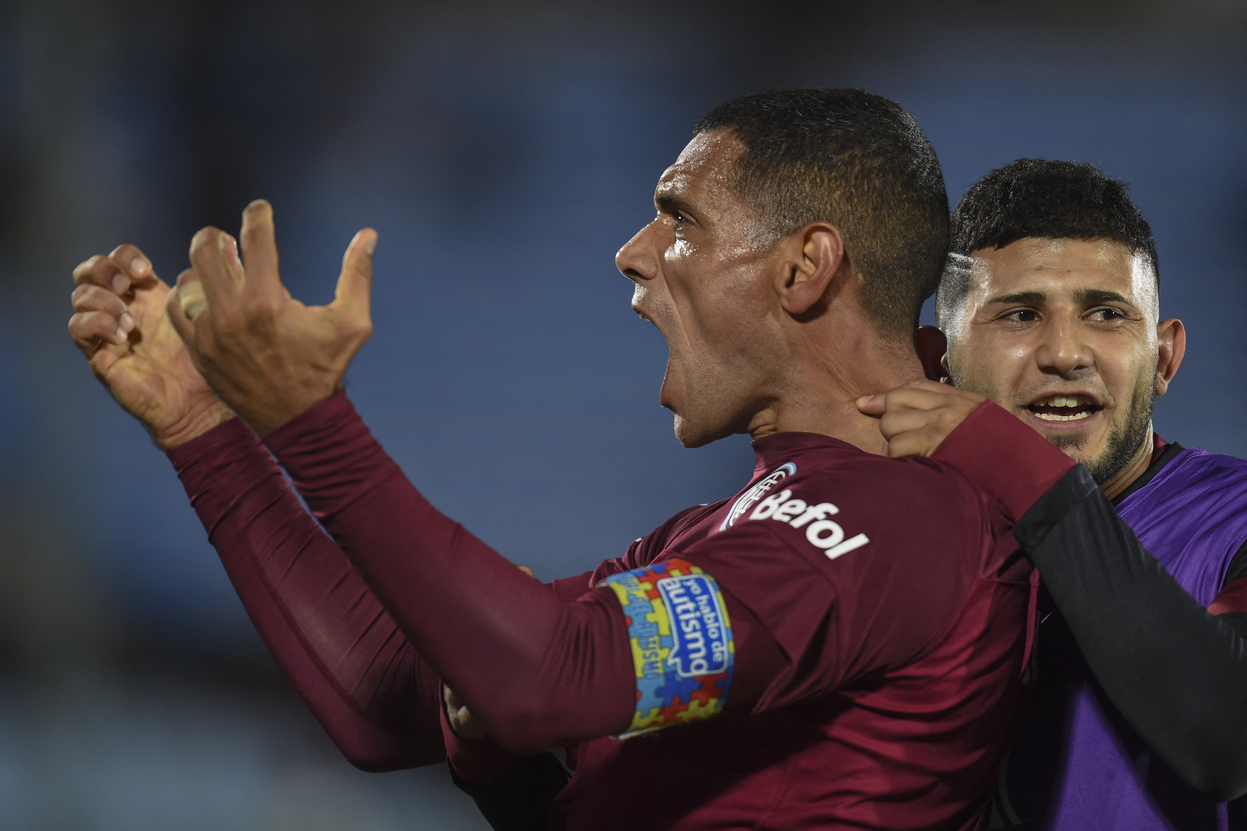Jose Sand de Lanus, festeja el gol ante Wanderers, en el estadio Centenario.