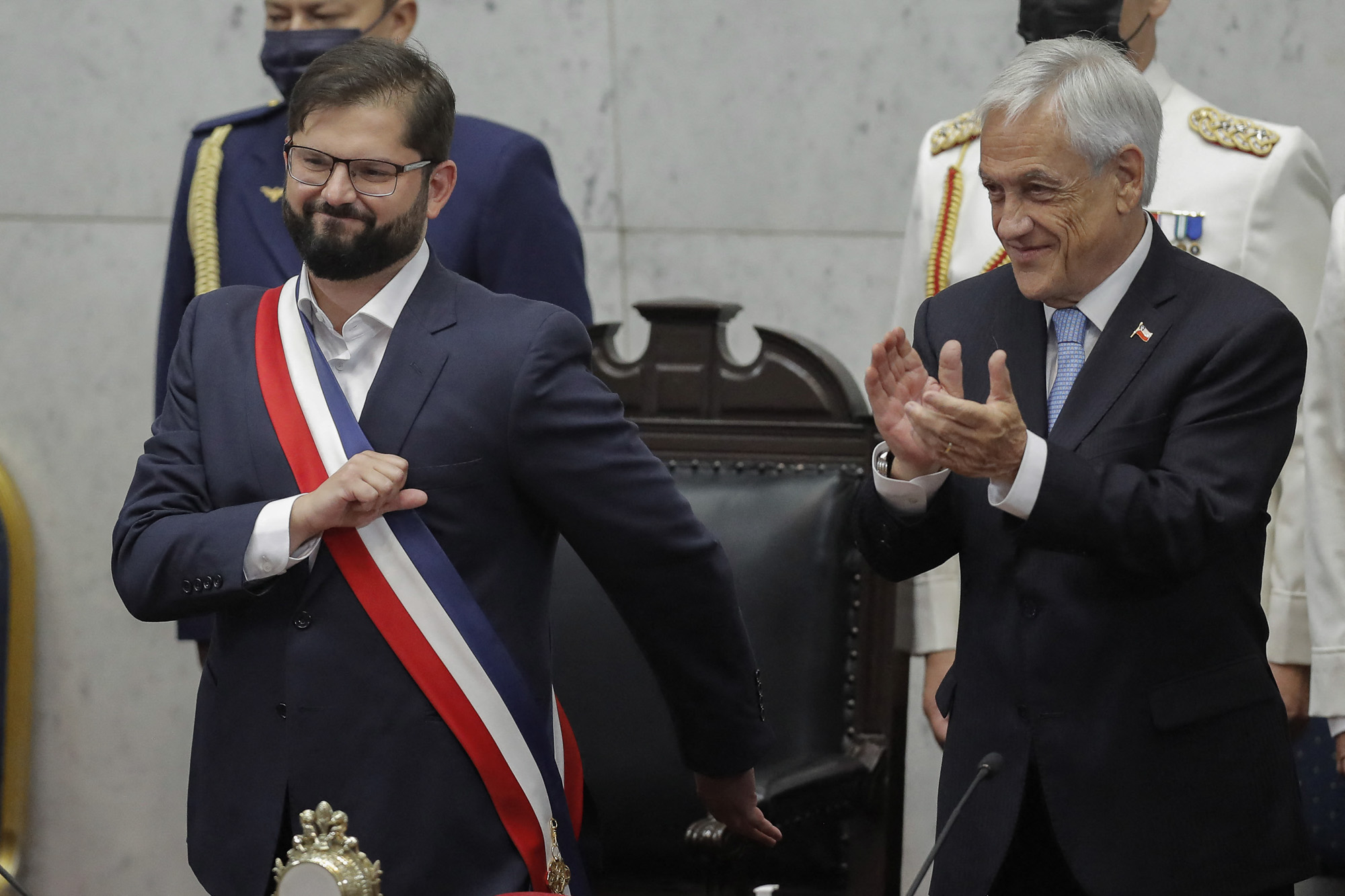 Gabriel Boric y el presidente saliente, Sebastián Piñera, durante la ceremonia de investidura en Valparaíso, el 11 de marzo.