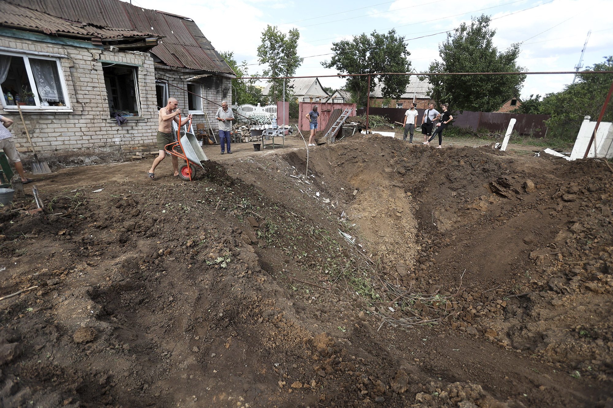 Residentes de Kostyantynivka rellenan un cráter después de un ataque ruso en esta ciudad de Donetsk.