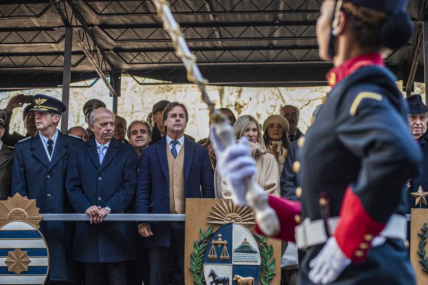 Javier García, Luis Lacalle Pou y Beatriz Argimón, durante el desfile cívico- militar por la Jura de la Constitución.