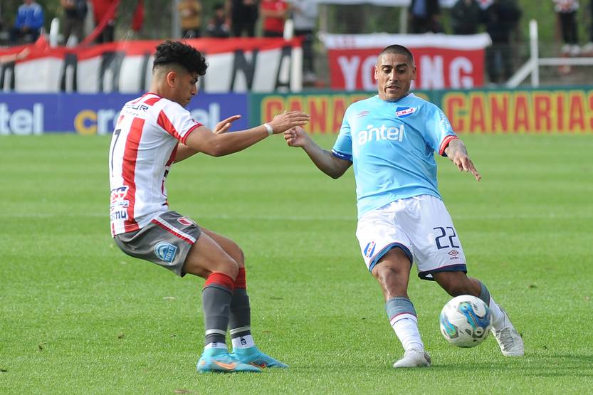 Matías Ocampo, de River Plate y Diego Zabala, de Nacional, el 17 de setiembre, en el Parque Saroldi.