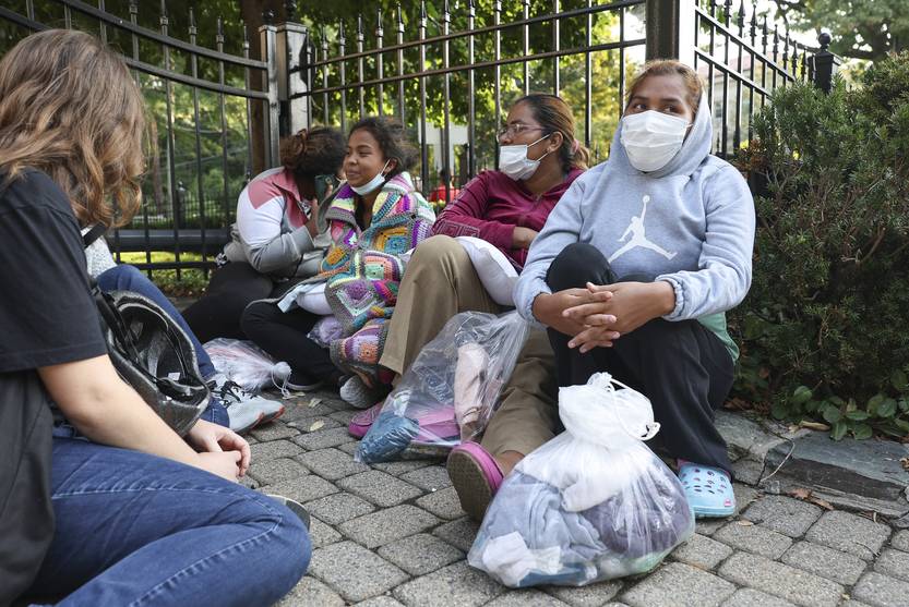 Migrantes latinoamericanos esperan cerca de la residencia de la vicepresidenta de Estados Unidos, Kamala Harris, en Washington, luego de ser trasladados desde la frontera sur en Texas en un operativo ordenado por el gobernador Greg Abbott.