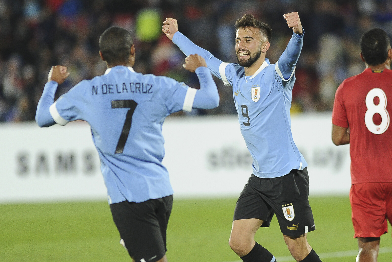 Diego Rossi y Nicolás de la Cruz, durante un partido amistoso en el estadio Centenario (archivo, junio de 2022).
