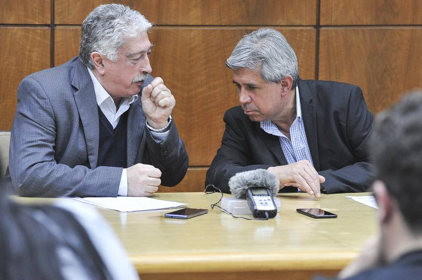 Ariel Ferrari y Ramón Ruiz, en el salón Colotuzzo del Banco de Previsión Social (30.09.2022).