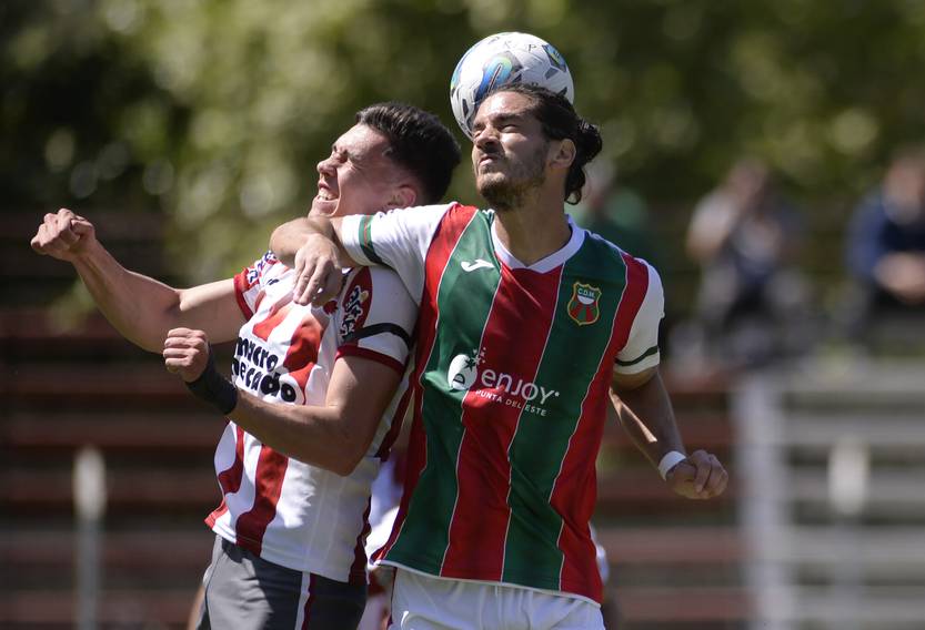 Joaquin Varela, de Deportivo Maldonado, y Thiago Borbas, de River Plate, durante el partido por la fecha 11 del torneo Clausura, el 2 de octubre, en el estadio Federico Saroldi.