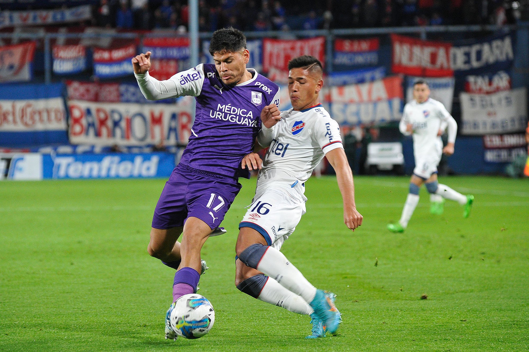 Agustín Sant'Anna, de Defensor Sporting y Leandro Lozano, de Nacional, el sábado 8 de octubre, en el estadio Gran Parque Central.