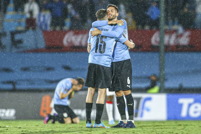 Diego Godín, Federico Valverde y Rodrigo Bentancur, de Uruguay tras vencer a Perú en el Estadio Centenario (24.03.2022).