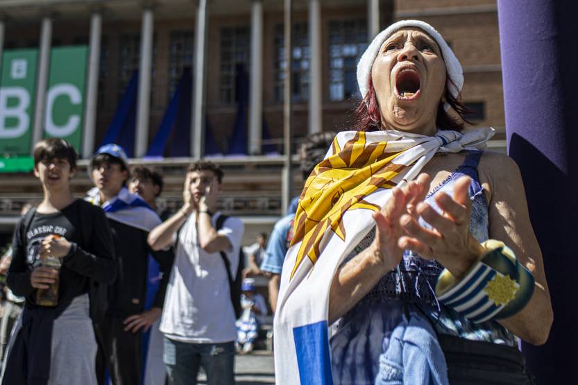 Partido de Uruguay y Corea del Sur, transmitido desde la pantalla del Impo, el 24 de noviembre, en 18 de Julio y Ejido, en Montevideo.
