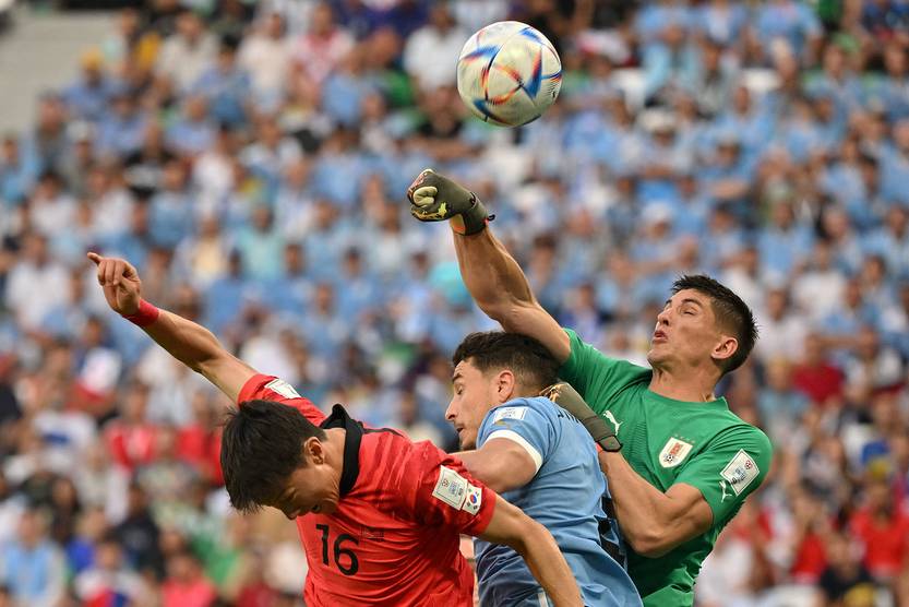 Hwang Ui-jo, de Corea del Sur, y Sergio Rochet, de Uruguay, el 24 de noviembre, durante el partido de fútbol del Grupo H de la Copa Mundial de Qatar 2022, en el Education City Stadium en Al-Rayyan, al oeste de Doha.
