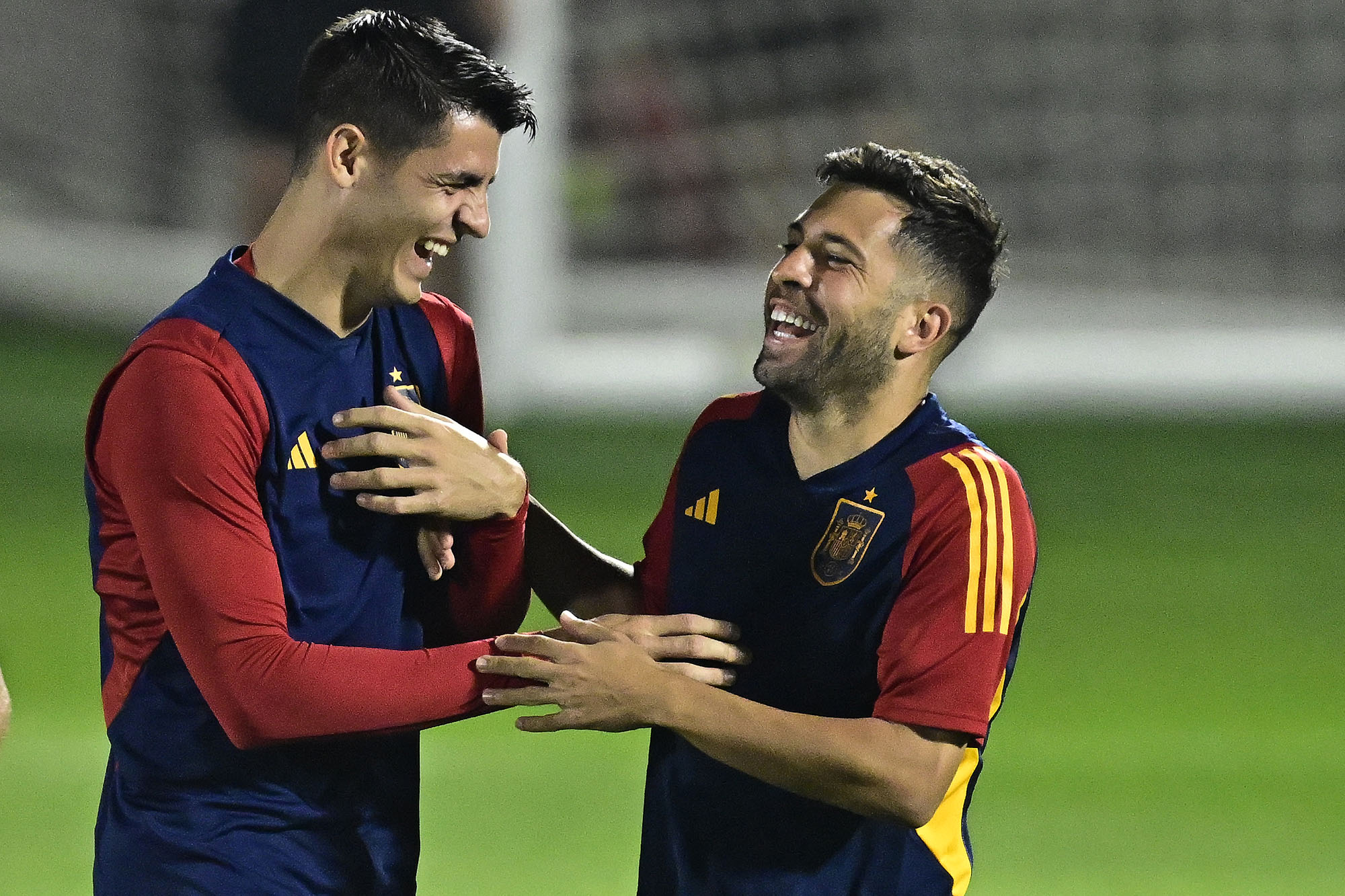 Álvaro Morata y Jordi Alba, el 30 de noviembre durante una práctica en el campo de entrenamiento de la Universidad de Qatar en Doha.