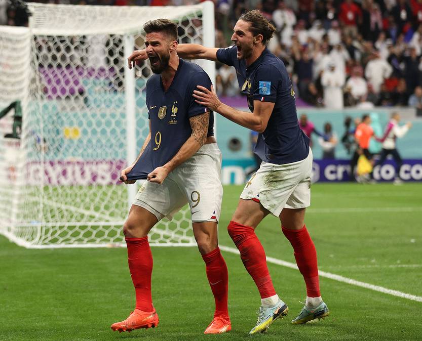 Olivier Giroud y Adrien Rabiot, de Francia, el 10 de diciembre durante el partido ante Inglaterra, en el estadio Al-Bayt en Al Khor, al norte de Doha.