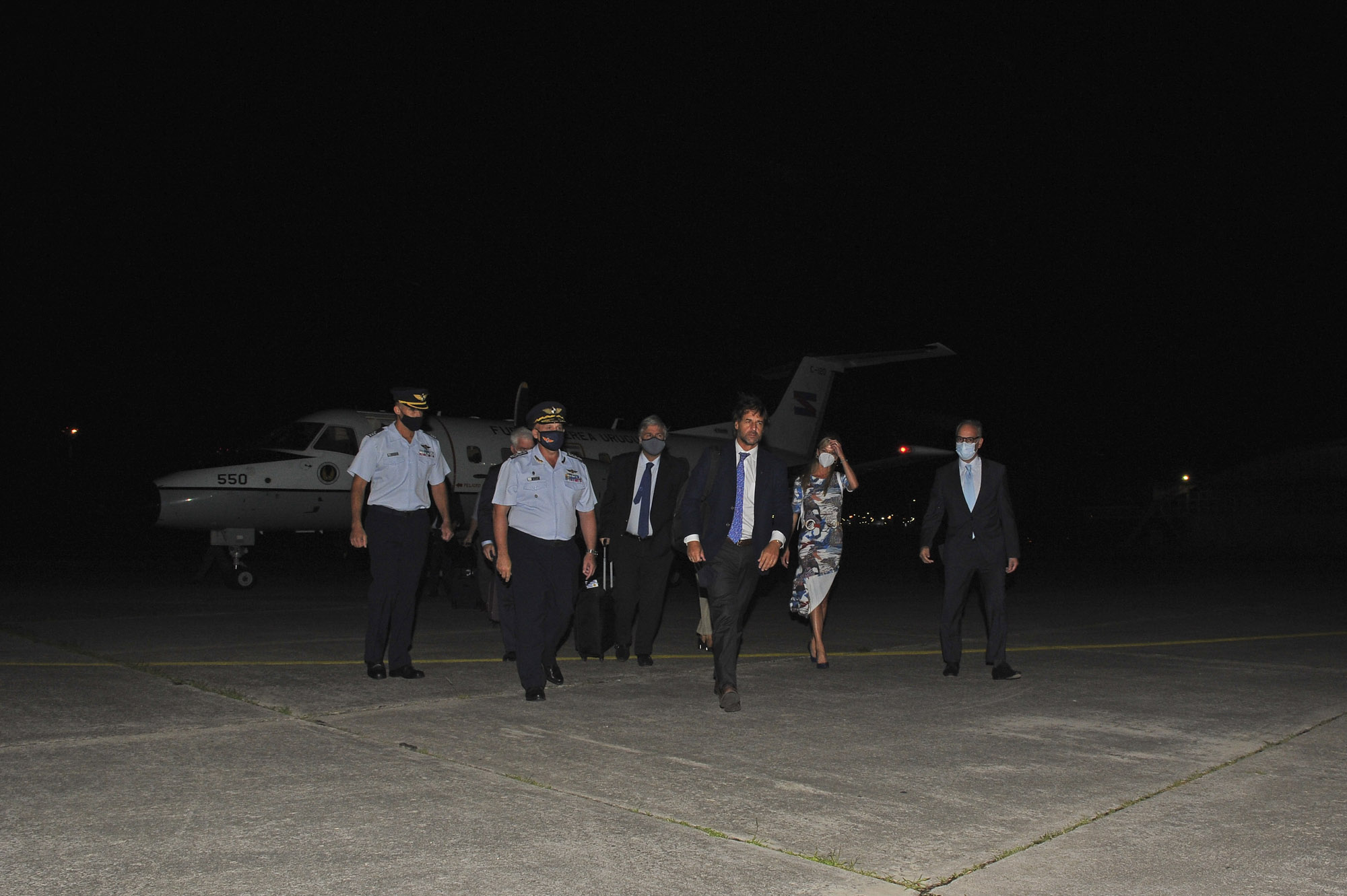 El presidente Luis Lacalle Pou, el canciller Bustillo y Lorena Ponce de León a su arribo desde Dubai, el 23 de febrero de 2022. , Presidencia de la República