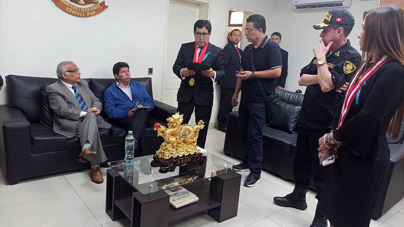 El destituido presidente peruano Pedro Castillo junto a su ex primer ministro Aníbal Torres, mientras permanece detenido, ayer, en la Prefectura de Lima, Perú. Foto: Justicia peruana