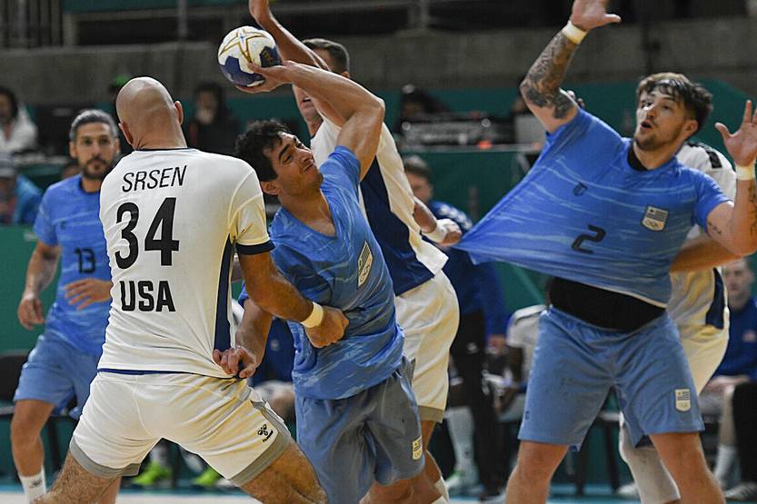 Domagoj Srsen, de Estados Unidos, Maximiliano De Agrela, de Uruguay, y Andrew Donlin, de Estados Unidos, durante el partido por el Grupo Preliminar B de Balonmano Masculino, el 1 de noviembre, en el Gimnasio Polideportivo de Viña del Mar.
