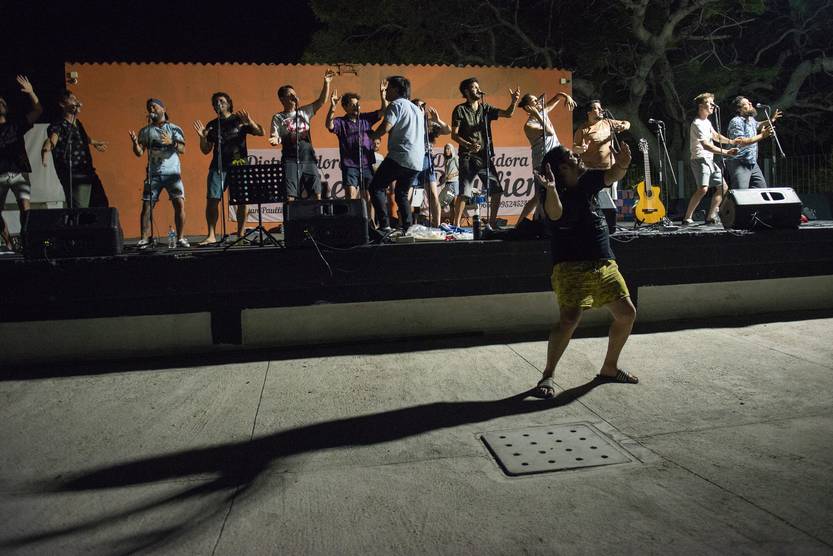 Ensayo de la murga Un Título Viejo, el 15 de enero, en el Tablado Flor de Maroñas.