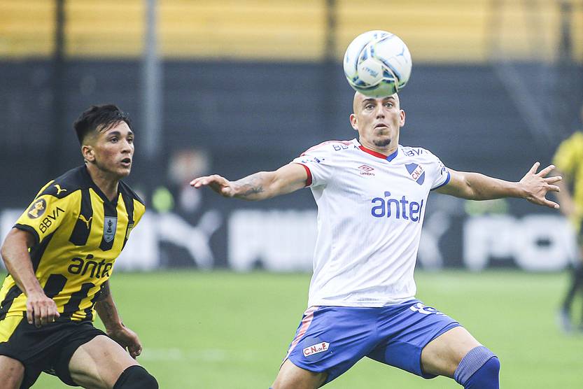 Ignacio Laquintana, de Peñarol, y Christian Almeida, de Nacional, durante un partido clásico en el estadio Campeón del Siglo. (archivo, febrero de 2022).