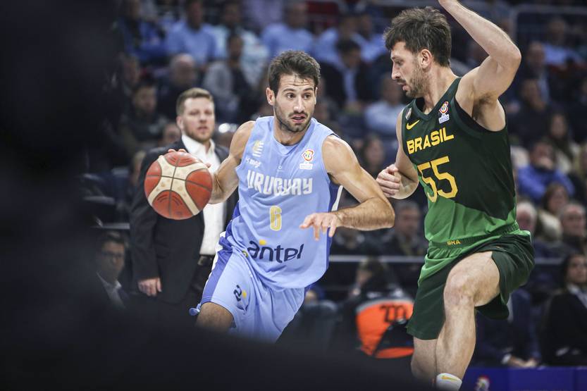 Bruno Fitipaldo, de Uruguay, y Elio Corazza, de Brasil, durante un partido por el torneo clasificatorio para el mundial 2023, en el Antel Arena (archivo, junio de 2022).