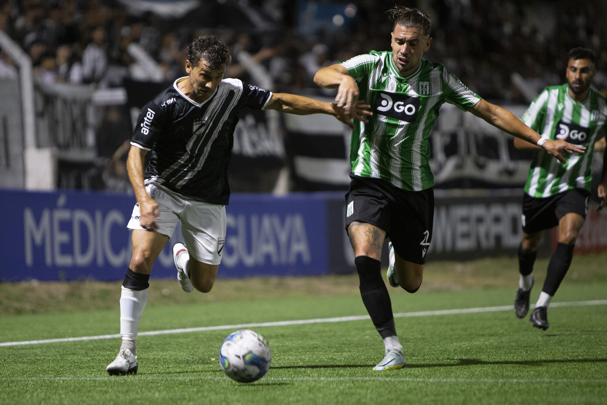 Sebastián Fernández, de Danubio, y Matías Velázquez, de Racing, el 3 de marzo, por la quinta fecha del Torneo Apertura, en el Parque Palermo.