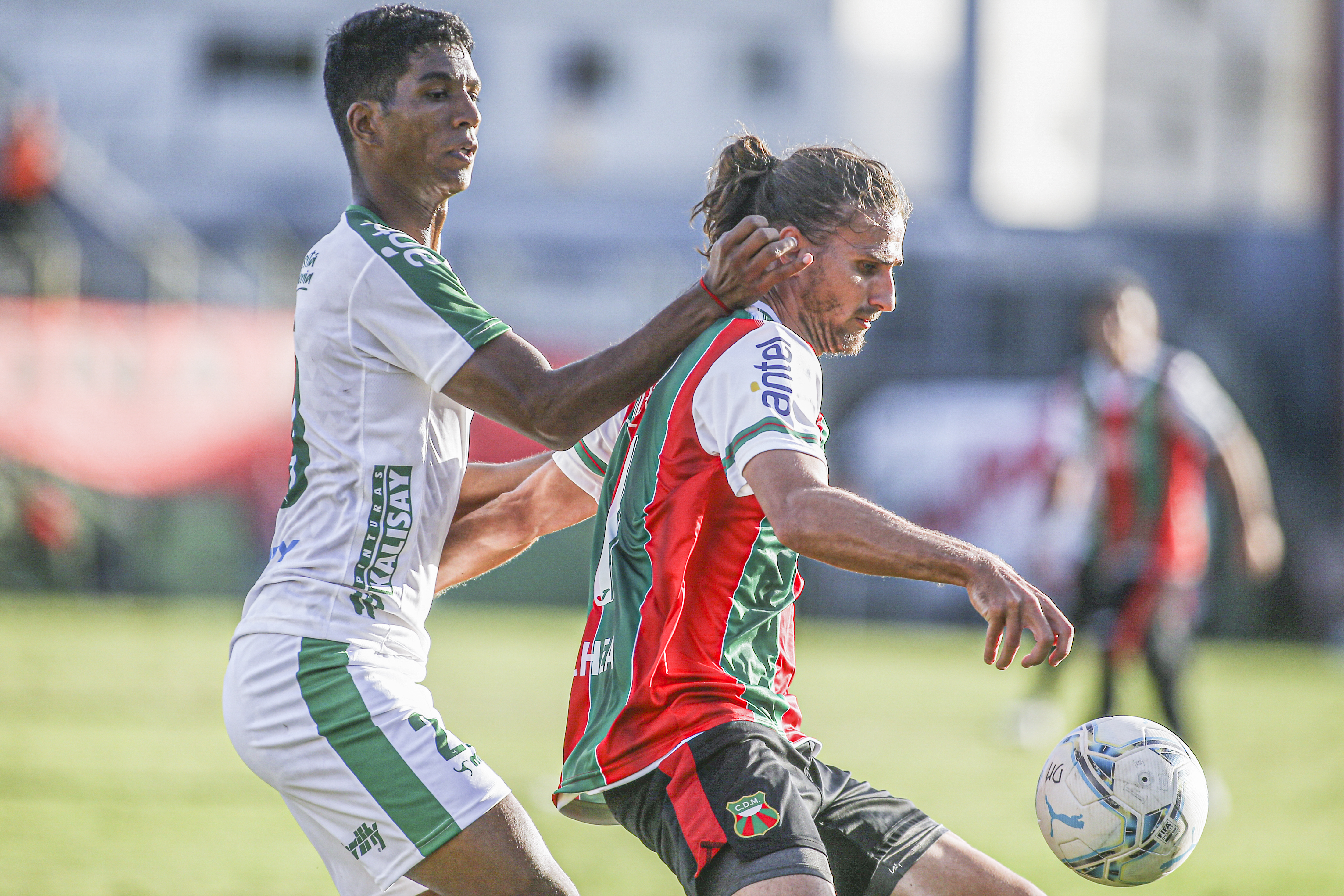 Matías Telechea, de Deportivo Maldonado y Jorge Ayala, de Plaza Colonia, en el Campus de Maldonado (archivo, abril de 2022).
