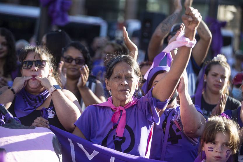 Conferencia del PIT- CNT, por el Día Internacional de la Mujer, en la plaza Independencia de Montevideo (archivo, marzo de 2022).