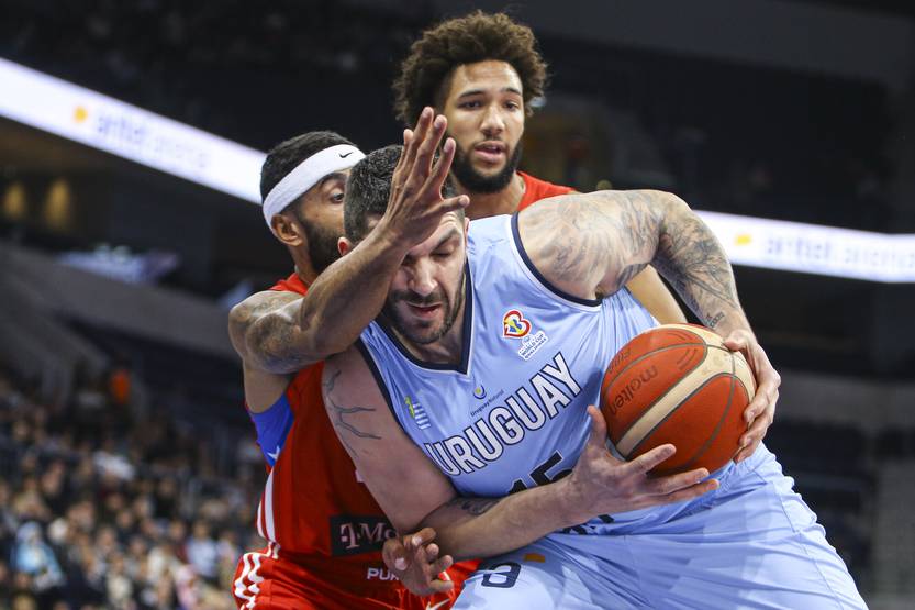 Esteban Batista, de Uruguay y Javier Mojica, y George Conditt, de Puerto Rico, durante un partido clasificatorio al mundial, en el Antel Arena (archivo, agosto de 2022).