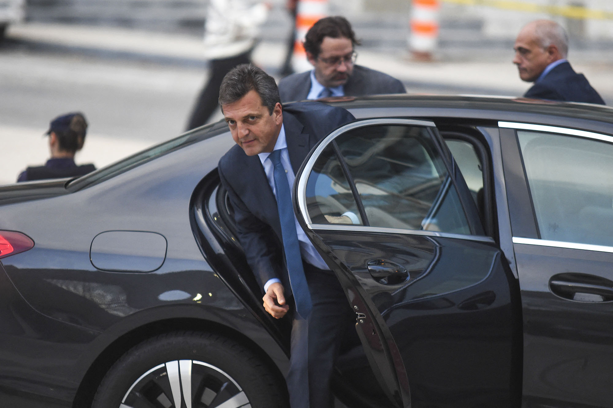 Sergio Massa arriba al CAF-Banco de Desarrollo de América Latina, el 27 de abril en Montevideo.