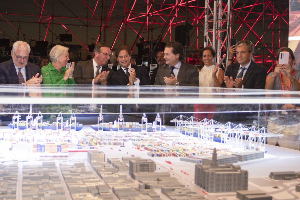Fernad Huts, Karine Huts, José Luis Falero, Luis Lacalle Pou, Rodrigo Ferrés y Juan Curbelo, durante la presentación del proyecto de la empresa Katoen Natie para el puerto de Montevideo (archivo, marzo de 2023).
