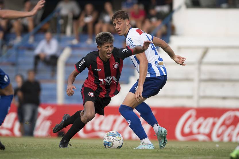 Alex Vázquez, de Miramar Misiones, y Valentín Gauthier, de Juventud de Las Piedras, durante el partido por la tercera fecha del Torneo Apertura, en el Parque Artigas (archivo, marzo de 2023).