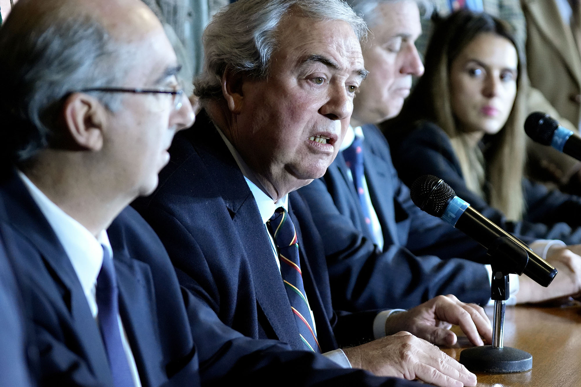 Guillermo Maciel, Luis Alberto Heber, Francisco Bustillo y Carolina Ache, durante una conferencia de prensa en la antesala de la Cámara de Senadores del Palacio Legislativo, en Montevideo (archivo, agosto de 2022).